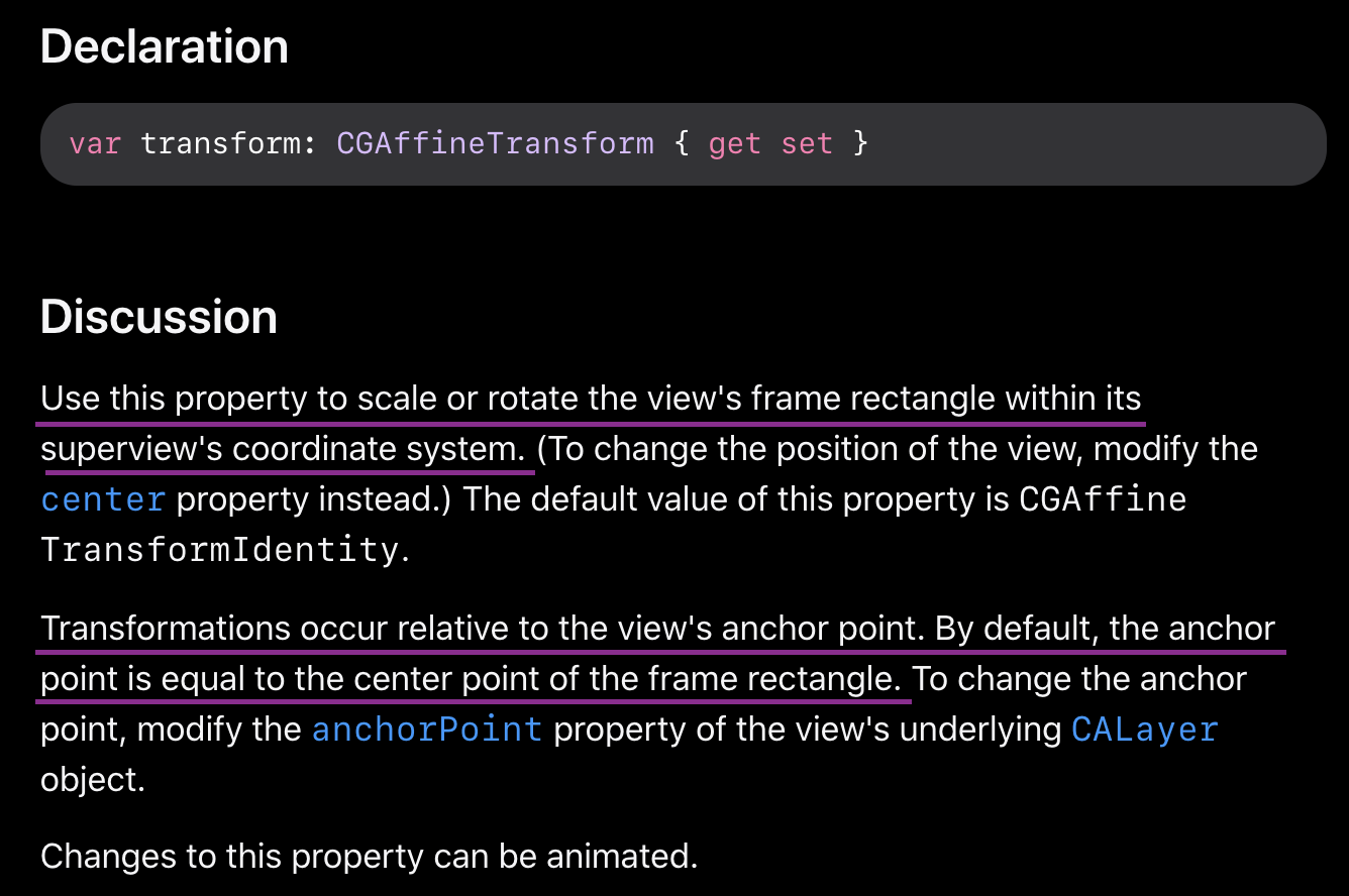 superview의 좌표 시스템 내에서 뷰의 프레임을 조정하거나 회전하는데 이 속성을 사용하네요.